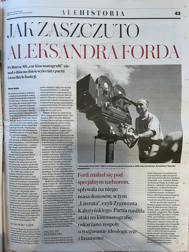 W weekendowym wydaniu "Magazynu Wyborczej" z 10 stycznia 2026 r. ukazała się obszerny artykuł Marka Beylina zainspirowany książką dr. Karola Szymańskiego i prof. Grzegorza Piotrowskiego "Nic mnie już tu nie trzyma", nazwaną przez autora "anatomią szczujni antysemickiej", która doprowadziła słynnego reżysera Aleksandra Forda do emigracji z Polski w 1969 r.