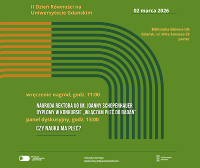 Wręczenie Nagrody im. Joanny Schopenhauer oraz uhonorowanie laureatek i laureatów konkursu „Włączam płeć do badań”, wykład prof. Nataszy Kosakowskiej-Berezeckiej i moderowana przez prof. Ewę Łojkowską debata „Czy nauka ma płeć” – to wszystko znajduje się w programie II Dnia Równości na Uniwersytecie Gdańskim. Zapraszamy do Biblioteki UG już 2 marca 2026 r.