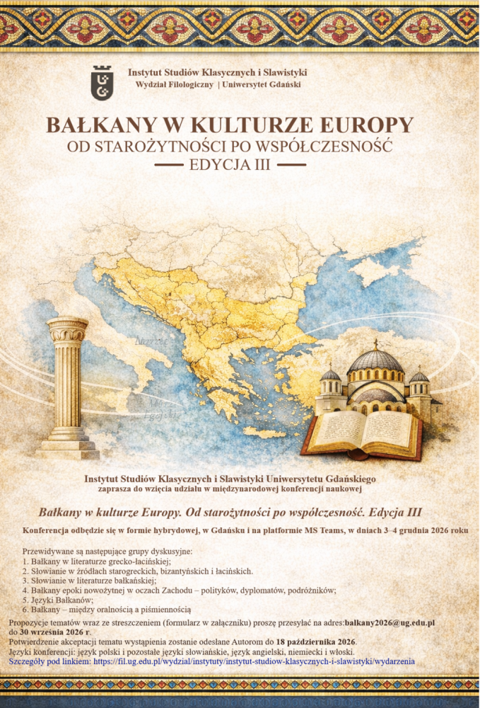 Program Instytut Studiów Klasycznych i Slawistyki Uniwersytetu Gdańskiego zaprasza do wzięcia udziału w międzynarodowej konferencji naukowej: Bałkany w kulturze Europy. Od…